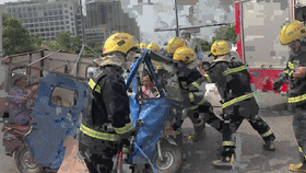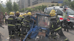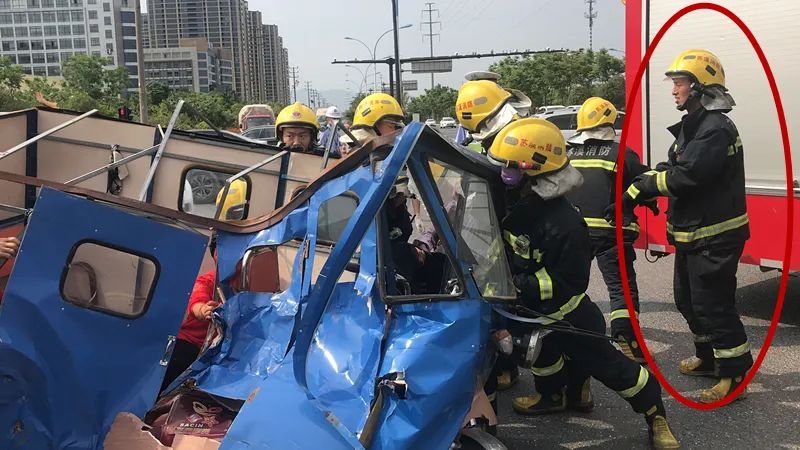 由于三轮车破损严重,已经变形,消防员利用液压钳、撬棍等工具对车门进行破拆,从车上抱下三轮车驾驶员。这一抱,韩米豆看清了驾驶员的脸,居然是他的岳父。