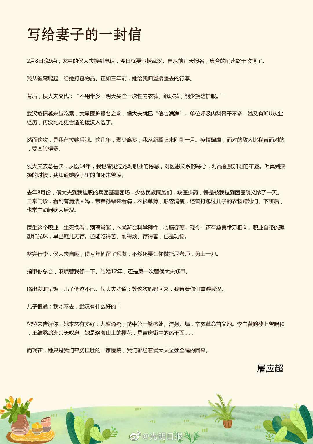 期间,屠应超在微信朋友圈给妻子写了一封信,信中写满了作为丈夫对妻子的深深牵挂。