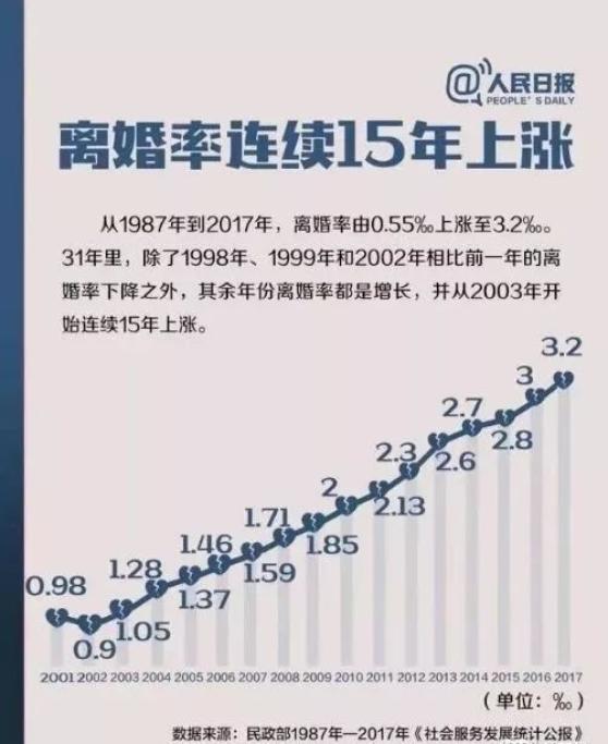 近十多年来,我国的离婚率持续攀升。民政部公布的数据显示,从2003年起,我国离婚率连续15年上涨。离婚登记数量也不断增加。2008年离婚人数仅226.9万对,2018年依法办理离婚手续的共有446.1万对。2019年全国离婚登记人数延续上升的趋势,2019年三季度全国登记离婚人数310.4万对,同比增长7.1%。中国从号称世界婚姻最稳定的国家成为全球离婚率最高的国家。