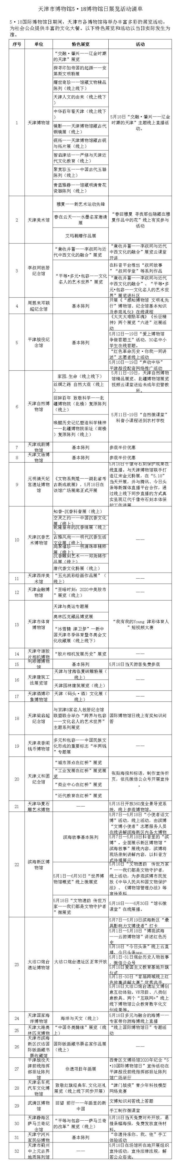 博物馆日当天,天津戏剧博物馆、文庙博物馆、利顺德博物馆、天津静海区萨马兰奇纪念馆等将免费或优惠对公众开放。