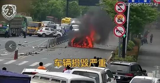 2020年5月7日,萧山市北消防救援站在接到报警后到达现场,事故起因是一辆新能源汽车冲撞马路中央护栏后发生火灾,仅仅几分钟内车辆就蔓延至全车燃烧,所幸车内人员已经逃脱。