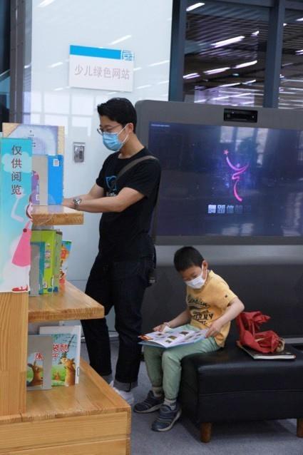 家长带孩子在馆内数字文化社区样板间阅读图书