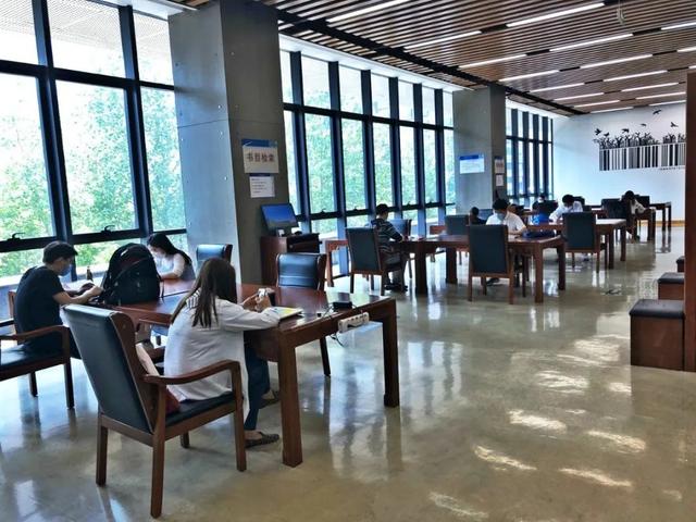 依窗而坐后,环顾四周,整个图书馆窗明几净,一排排整齐的书架庄严地矗立着,仿佛散发着阵阵墨香;一张张光亮的大书桌,豪气又厚重,好似承托着求知的渴望……好一阵遐思,轻翻着书页,我心满意足。由于要保持一米的安全距离,读者错位而坐,视野更加开阔,格外舒适。看着书架上的提示标语“书海任我游,有序更无忧”,我觉得格外有亲切感。