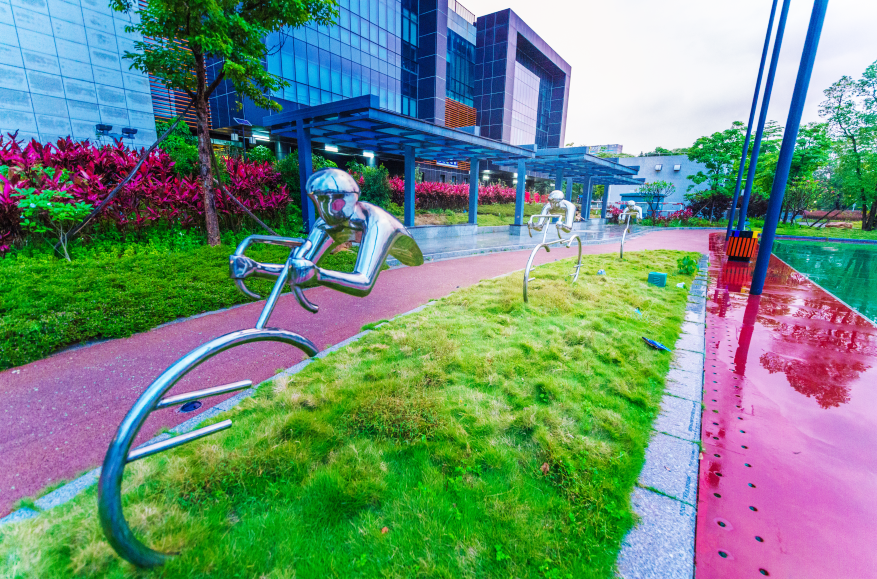 从北入口进入体育公园,一组武术与体育元素雕像生动形象,强健的体魄,灵活的身姿展现了“生命不息,运动不止”的活力。