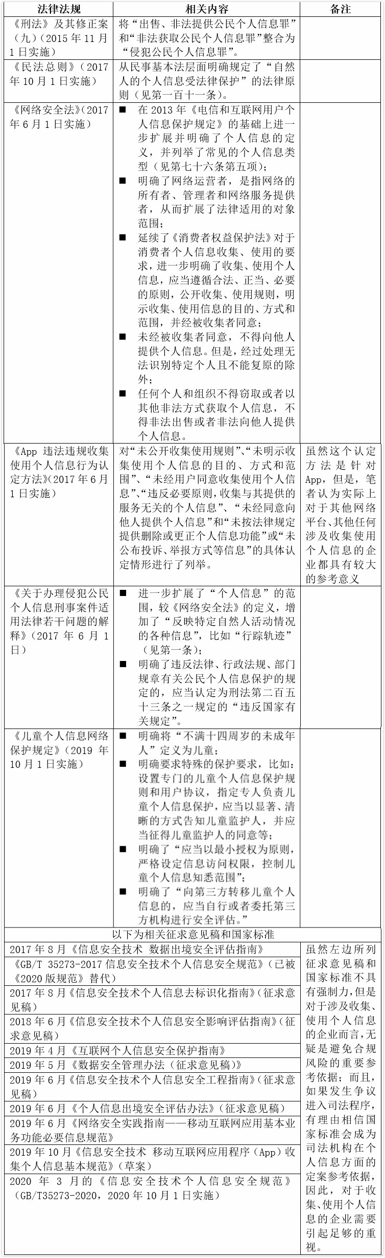 我国目前个人信息保护方面的法律法规,散见于各法律法规、规章及标准,已经明确对个人信息的保护提供了原则性、纲领性的规定。目前的主要规定及所涉的重点内容以表格形式简述如下: