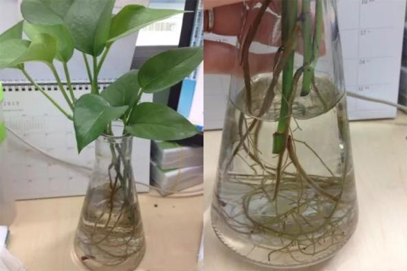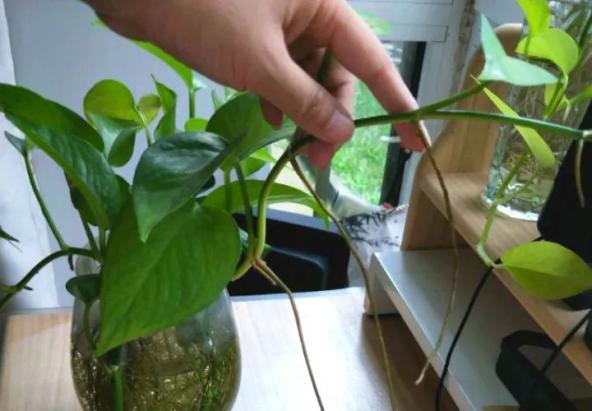 随便剪下一段带气根的绿萝,水插成活率99%,而且生根快,不用担心黄叶的问题,根系健壮绿萝自然长的好啦~