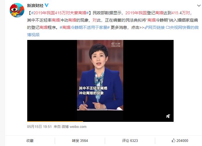 民政部2020公开数据表示,2019年办理结婚登记人数947.1万对,离婚登记415.4万对。