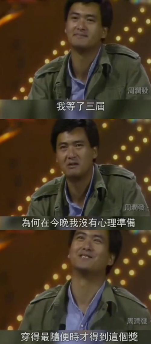 领奖台上,从拍摄现场赶来的周润发风尘仆仆,穿着一身戏中的夹克说:“我等了三届,为何在我最没有心理准备,穿得最随便时,才得到了这个奖。”