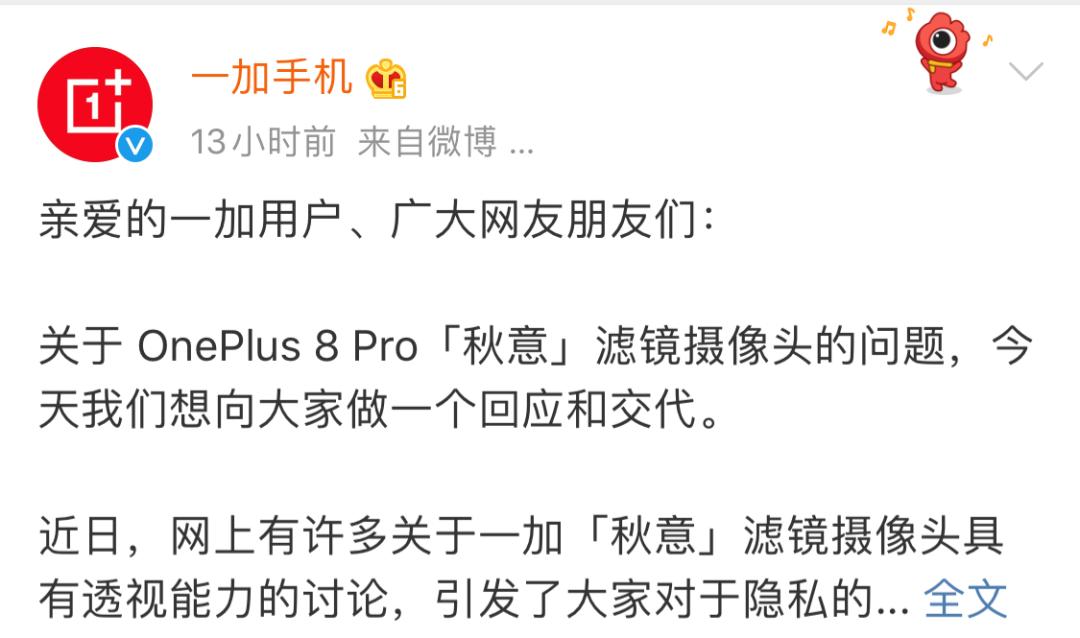 近日,网上有许多关于一加「秋意」滤镜摄像头具有透视能力的讨论,引发了大家对于隐私的担忧,给一加用户和广大网友带来了困扰,我们深表歉意。