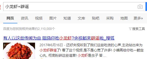 以“小龙虾+辟谣”为关键字进行搜索发现,相关结果多达211万条,其中大部分结果都是各大媒体平台和自媒体的辟谣文章。按说,浅显易懂的辟谣知识、数以百万计的辟谣文章可以让小龙虾谣言断根,但是为什么小龙虾谣言就是会应季出现、层出不穷?