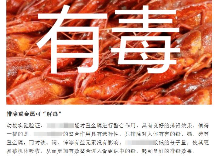 以网上流传的一篇题为《五月小龙虾虽好吃,但可能引来“哈夫病”》的文章为例。相关文章标题虽提及“哈夫病”,但正文并未对“吃小龙虾会得哈夫病”有详细介绍和提醒,反而话锋一转,开始控诉小龙虾重金属超标的问题;在一堆毫无根据的指控之后,又开始介绍一种能够帮助人体“去除”重金属的保健品。文章最后还打出,“吃小龙虾,搭配该品牌保健品更安全、更放心”的口号,并附上相关产品的购买方式。