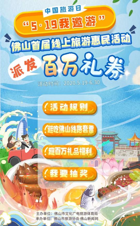 5月19日是中国旅游日,为促进企业复工复产,给市民带去更多消费实惠,推动文旅体餐饮行业全面复苏,佛山市文化广电旅游体育局联合佛山市旅游协会、佛山新闻网推出“5·19我邀游”佛山首届线上旅游惠民活动,提供免费景区景点门票、酒店民宿房券、餐饮美食券等福利,为市民游客带来一大波福利。