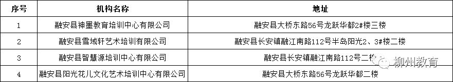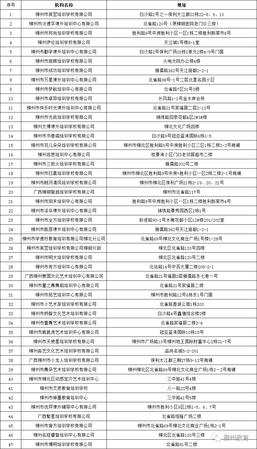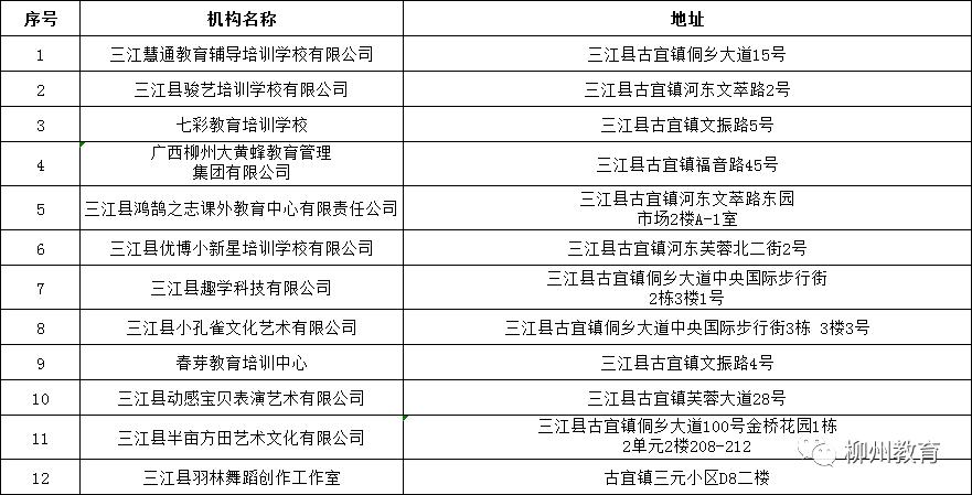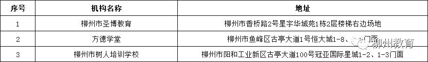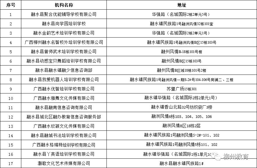 根据《柳州市教育系统新型冠状病毒感染的肺炎疫情防控工作领导小组关于做好2020年春季学期全市小学开学工作的通知》要求,自5月6日起各县区教育部门与卫生健康、公安、消防、市场监管等部门,对申请恢复线下培训的校外培训机构开展了逐一联合检查评估。现将第一批可恢复线下培训的297所校外培训机构名单予以通报。