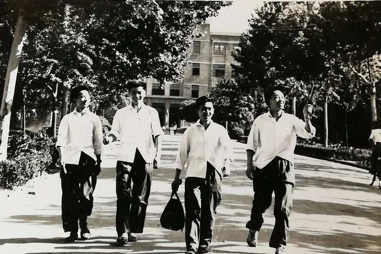 下图:历史系75级校园教学楼合影。左起丁同言、郑尔旺、俞方臣、高建平