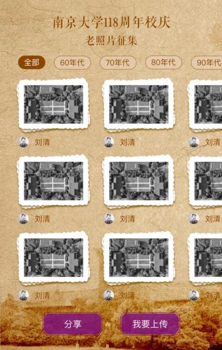 第二步:返回小程序首页,点击“校庆专区”——“南望时光”——“上传照片”。根据提示选择拍摄年代,并友情添加适当描述,点击“提交”,待审核通过后即可展示在活动首页。