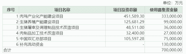 此次公司非公开发行所募集资金在扣除发行费用后,将全部用于肉鸡产业化产能建设项目、生猪养殖产能建设项目、生猪屠宰及调理制品技术改造项目、肉制品加工技术改造项目、中国双汇总部项目和补充流动资金。