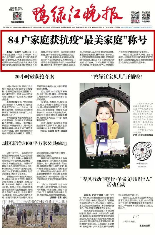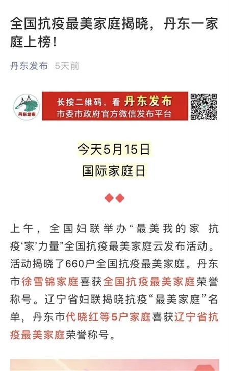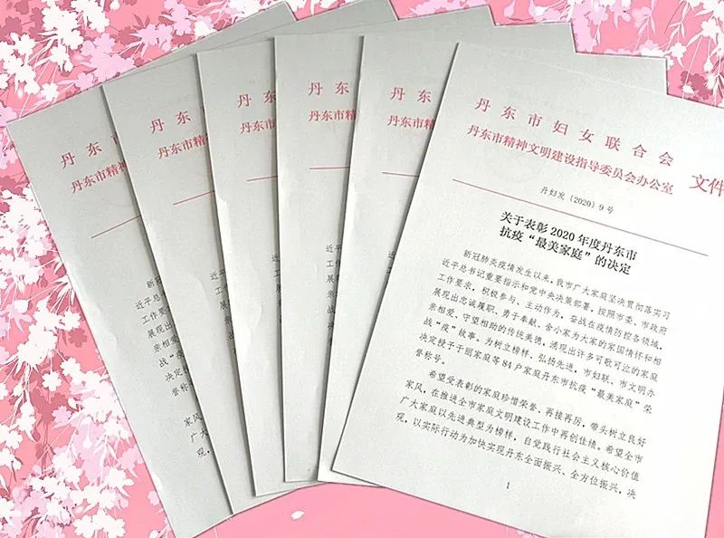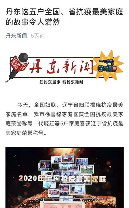 市妇联在“丹东巾帼情”微信公众平台设置“聆听家庭故事、感受最美风采”专栏,展播抗疫最美家庭事迹。丹东电视台、丹东广播电台、丹东发布、丹东新闻网、丹东日报等全媒体展播抗疫最美家庭事迹及获得全国、省抗疫最美家庭名单,在全社会营造学习家庭典型的浓厚氛围。