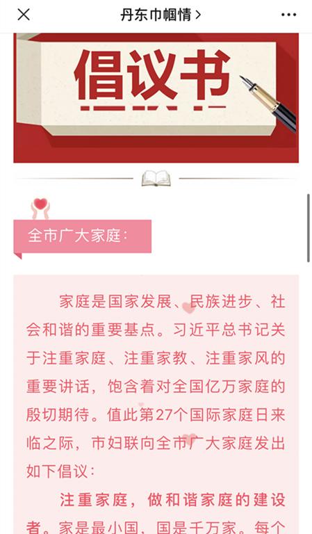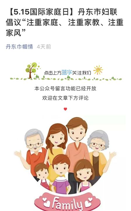 为进一步深入贯彻落实习近平总书记关于注重家庭家教家风建设重要指示精神,丹东市妇联以5.15国际家庭日为契机,集中开展家庭家教家风宣传展示活动,不断深化家庭文明创建工作,充分发挥家庭家教家风在基层社会治理、弘扬时代新风中的重要作用。