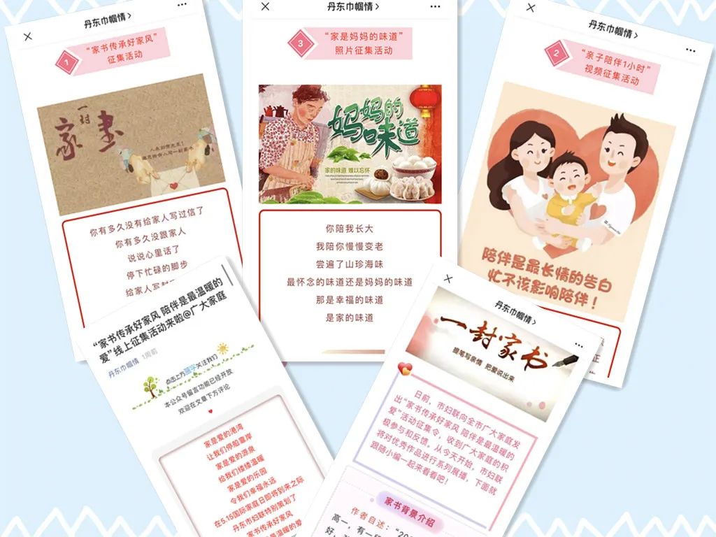 以“家书传承好家风 陪伴是最温暖的爱”为主题线上征集亲情家书、亲子一小时陪伴视频、家是妈妈的味道主题照片,邀请全市家庭广泛参与,并择优进行展播,弘扬中华民族传统文化,以“小家”的和谐促进“大家”的稳定。