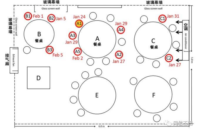 A和B家庭分别坐了53分钟,A和C家庭坐了73分钟。中央空调的出风口和回风口位于C桌上方。而A家庭刚刚从武汉回来,结果均被感染。