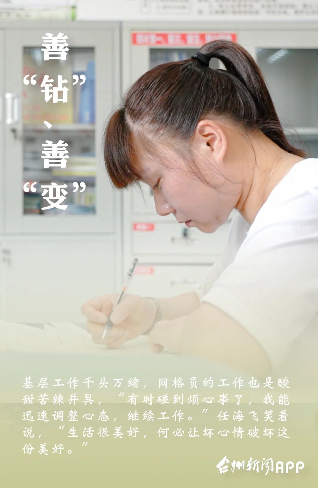 学得快,成长得也快!没过几个月,任海飞就能顺当地扛起网格员的职责,而且在工作中她还练出了一个本领,“在10秒钟内能够迅速调整状态。”基层工作千头万绪,网格员的工作也是酸甜苦辣并具,“有时碰到烦心事了,我能迅速调整心态,继续工作。”任海飞笑着说,“生活很美好,何必让坏心情破坏这份美好。”