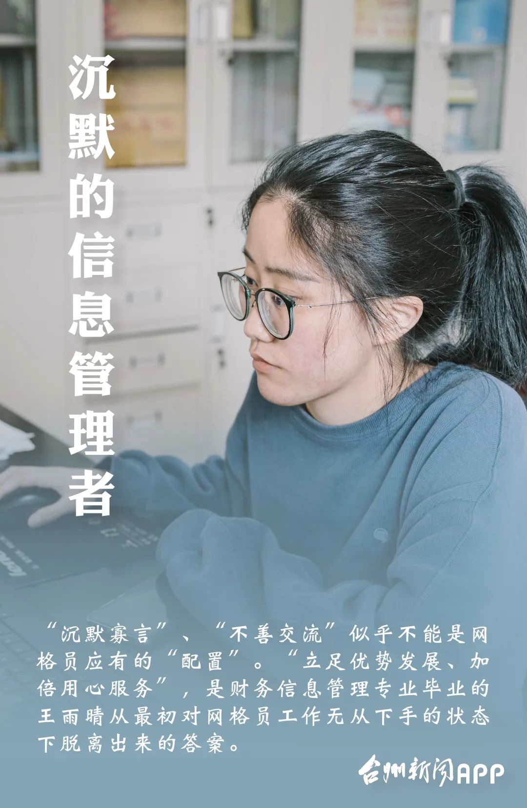 和天生乐观活泼的老六截然相反的是“老小”王雨晴。“沉默寡言”、“不善交流”似乎不能是网格员应有的“配置”,而2018年毕业的王雨晴,却已在这个岗位上工作了两年。