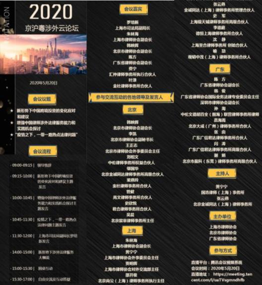 2020年5月20日,全国首届“京沪粤涉外云论坛”成功举办。本次论坛由上海市律师协会、北京市律师协会和广东省律师协会联合举办,以线上交流的方式进行,旨在加强京沪粤三地法律界相互交流,促进全国性涉外法律合作,推动中国涉外法律服务业的发展。上海市司法局副局长罗培新、上海市律师协会副会长朱林海、北京市律师协会副会长韩映辉、广东省律师协会副会长陈方,以及京沪粤三地律师协会外事委员会、涉外委员会、一带一路业务研究委员会主任及委员们约300人应邀参加了本次论坛。