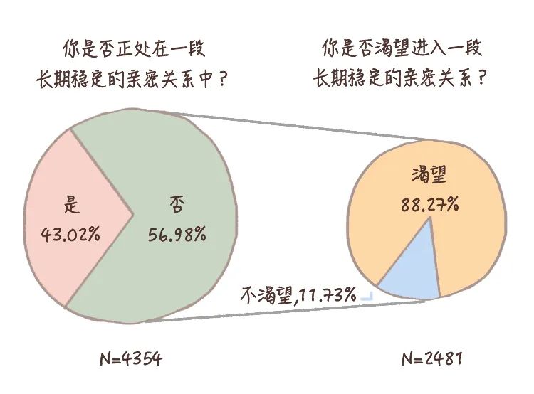 在那些目前未处在长期稳定的亲密关系中的被访当中,有88.27%的被访表示,自己仍然渴望进入一段长期、稳定的亲密关系。