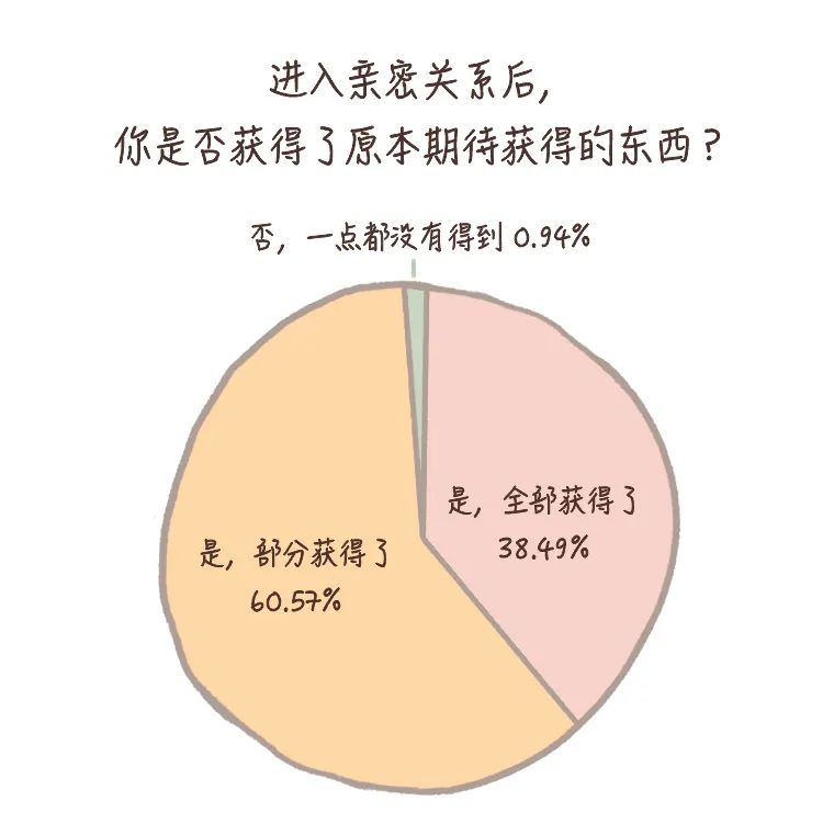 在那些进入亲密关系之前清楚自己想要获得什么的被访当中,60.57%的被访表示,自己原本的诉求有一部分在关系中得到了满足。