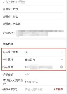 进入办理界面后,核对房屋基本信息及转账信息,若需更换转账账号的,可对“转入账户类型”、“转入银行”、“转入账号”项目进行修改。