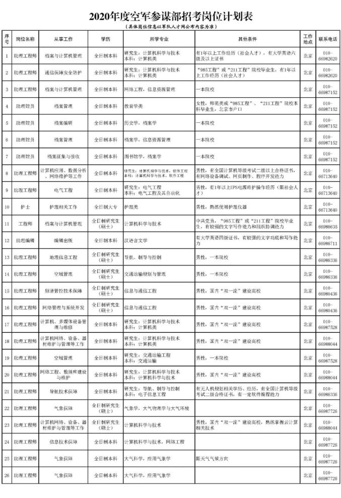 今年,我部计划在工程、档案、卫生、出版、行政管理以及综合管理保障等26个岗位招考文职人员,诚挚欢迎广大有志青年踊跃报考,加入我们并肩奋斗,为建设空天一体、攻防兼备的世界一流空军贡献青春、凝聚力量!