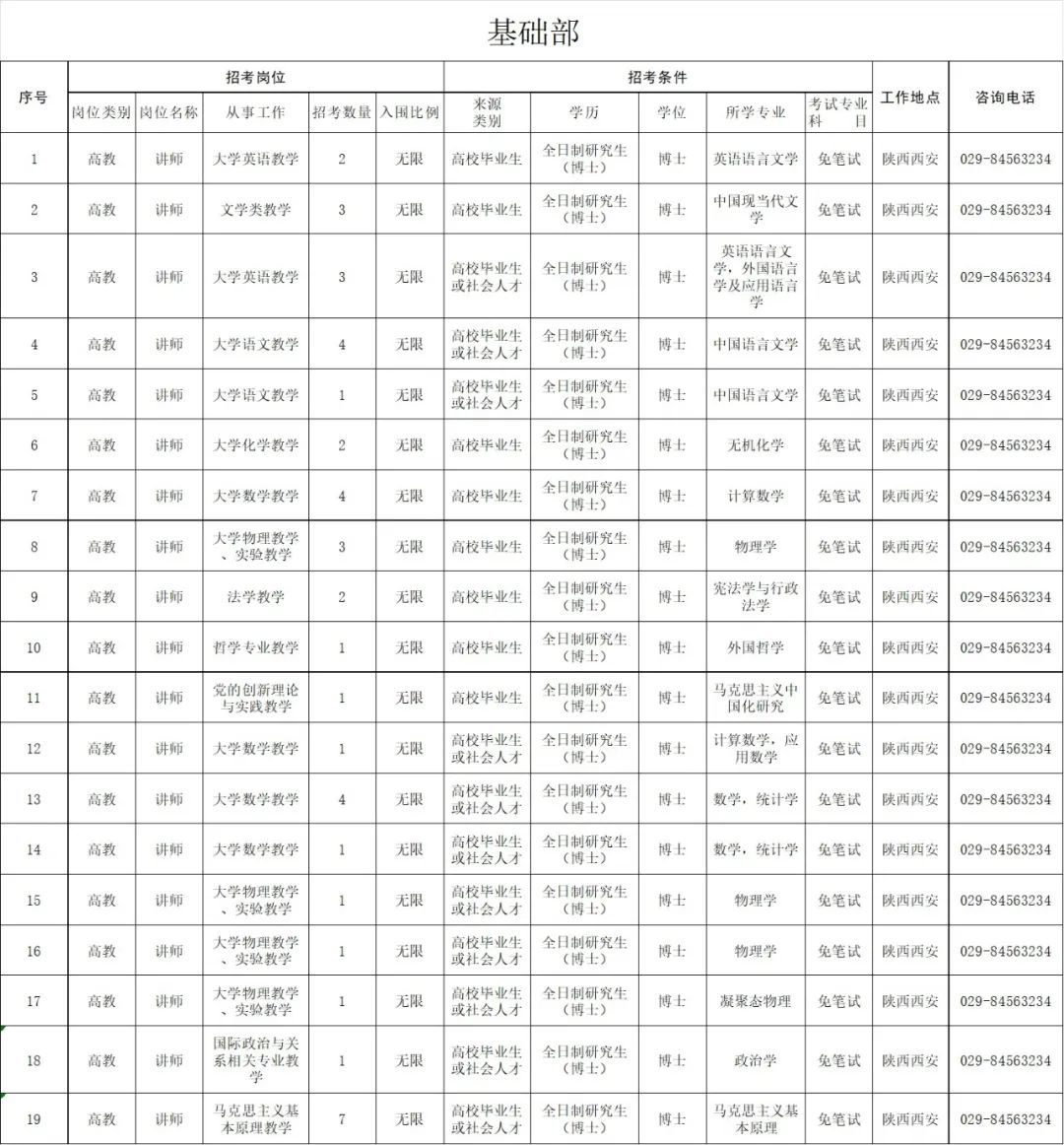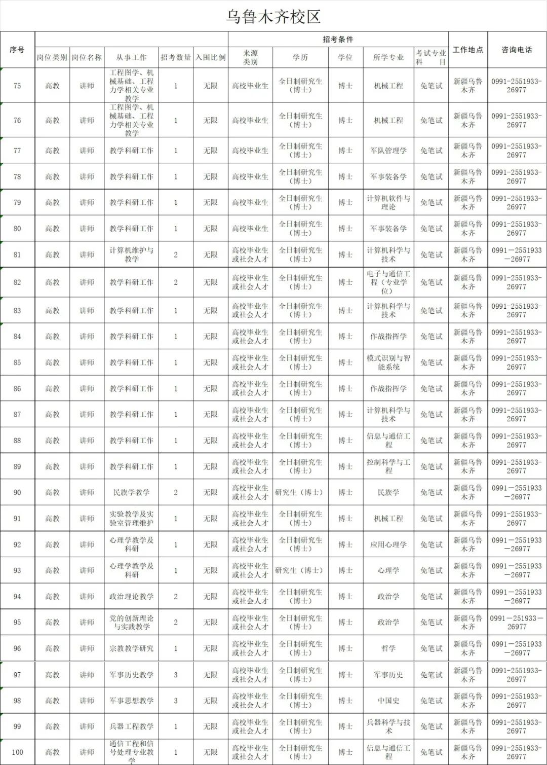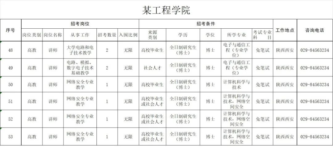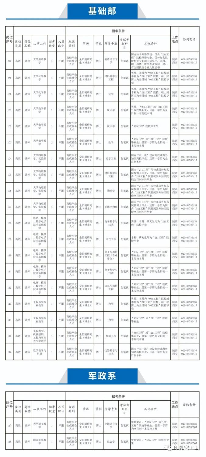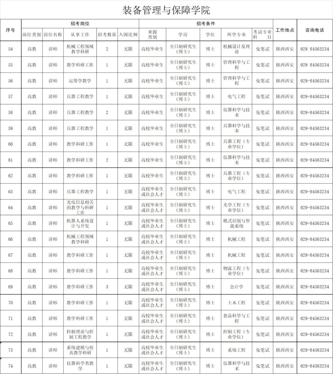 2020年大学面向社会公开招考博士岗位计划共100个,共154人(硕士以下岗位与全军2020年面向社会公开招考文职人员岗位一并公布,具体以中国人民解放军军队人才网正式公布内容为准),岗位需求见附件《武警工程大学2020年面向社会公开招考文职人员博士岗位计划》。