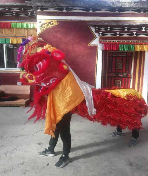 经过几天的忙碌,八角楼村的狮子形象终于展现在我们面前。我们看见过藏区舞狮子的情形,但八角楼村的狮子从外形上与其他地方的狮子形象不大相同,有一种独特的扮相。