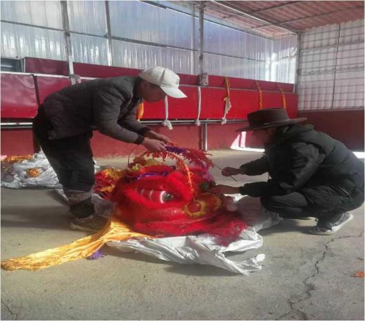 每年腊月进入春节倒计时,村里青年男子们便相约在一起,到“洞科”(转经房)场坝将珍藏的“老狮子”(往年的狮子)竹架取出来整理并进行装饰打扮。临近春节,八角楼村的年轻人在康巴汉子斯郎的带动下开始为过年期间的活动作准备,斯郎是村里组织文娱活动的热心人,也是村里最会装扮狮子和跳狮子的人。