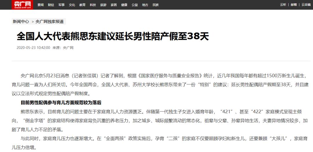 今年全国两会,全国人大代表、苏州大学校长熊思东带来了一份“特别”的建议:延长男性配偶陪产假期至38天,并且建议以立法形式规定男性配偶陪产假制度。