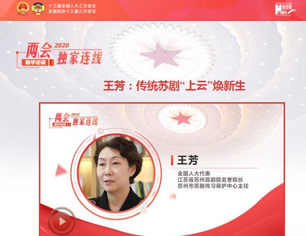 2020全国两会开幕前夕,新华网2020两会特别连线采访了全国人大代表、江苏省苏州昆剧院名誉院长、苏剧传习保护中心主任王芳,就戏曲艺术的“云端”建设进行了解读。