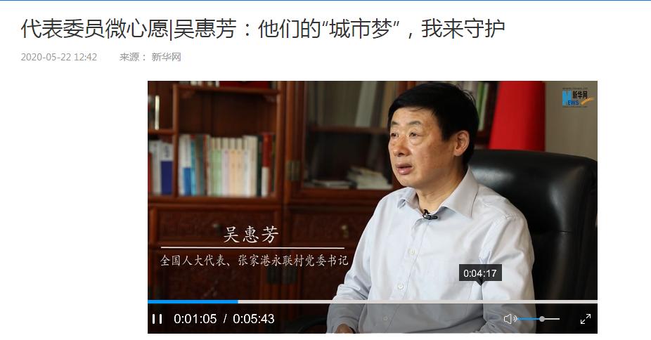 2020全国两会开幕前夕,新华网采访了全国人大代表、江苏省苏州市张家港永联村党委书记吴惠芳。在吴惠芳的带领下,永联老百姓人均年收入已经达到了45800元以上。