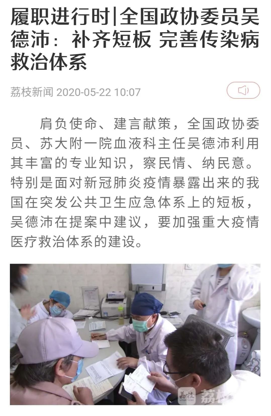 5月22日,荔枝新闻刊发了对全国政协委员、苏大附一院血液科主任吴德沛的采访。吴德沛在提案中建议,要加强重大疫情医疗救治体系的建设。