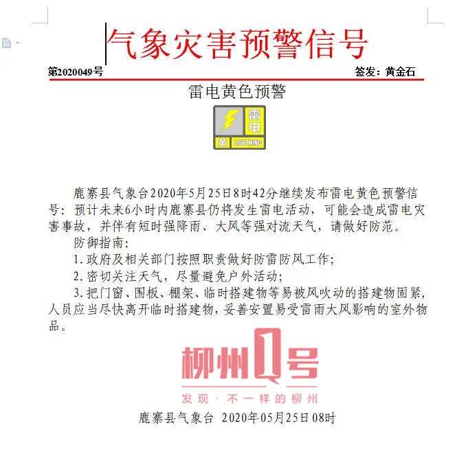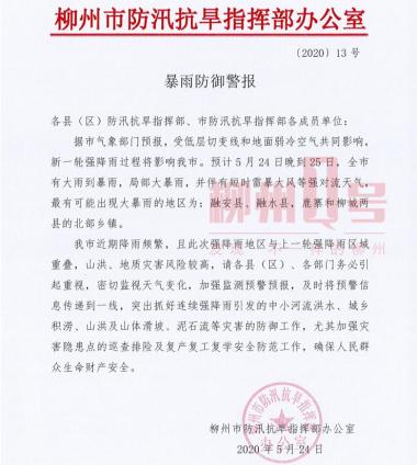 鹿寨县气象局8时42分发布雷电黄色预警信号,暴雨主要对鹿寨北部乡镇影响较大,暴雨橙色预警信号已发布,最大雨量达63.7毫米。