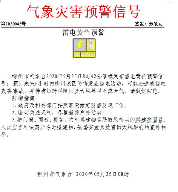 柳州市气象台发布雷电黄色预警