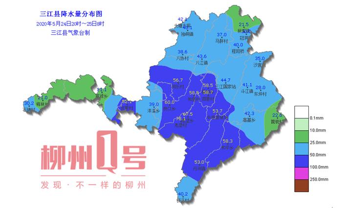 2020年5月24日8时~25日8时,受高空波动、低层切变线和地面弱冷空气共同影响,柳城县大部乡镇出现了中雨,局部大雨。据自动站统计,全县出现中雨以上有29站,其中大雨以上2站,最大雨量出现在东泉镇站(38.7毫米)。