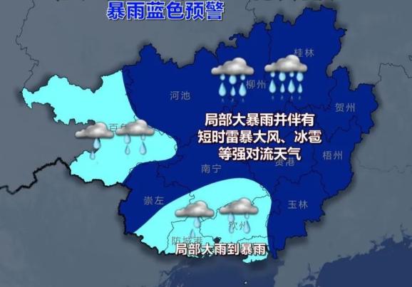 今天白天广西境内将迎来强降雨强对流天气,除了沿海雨势稍小一些之外,有11个地市出现大雨或暴雨,局部大暴雨并伴有短时雷暴大风、冰雹等强对流天气。