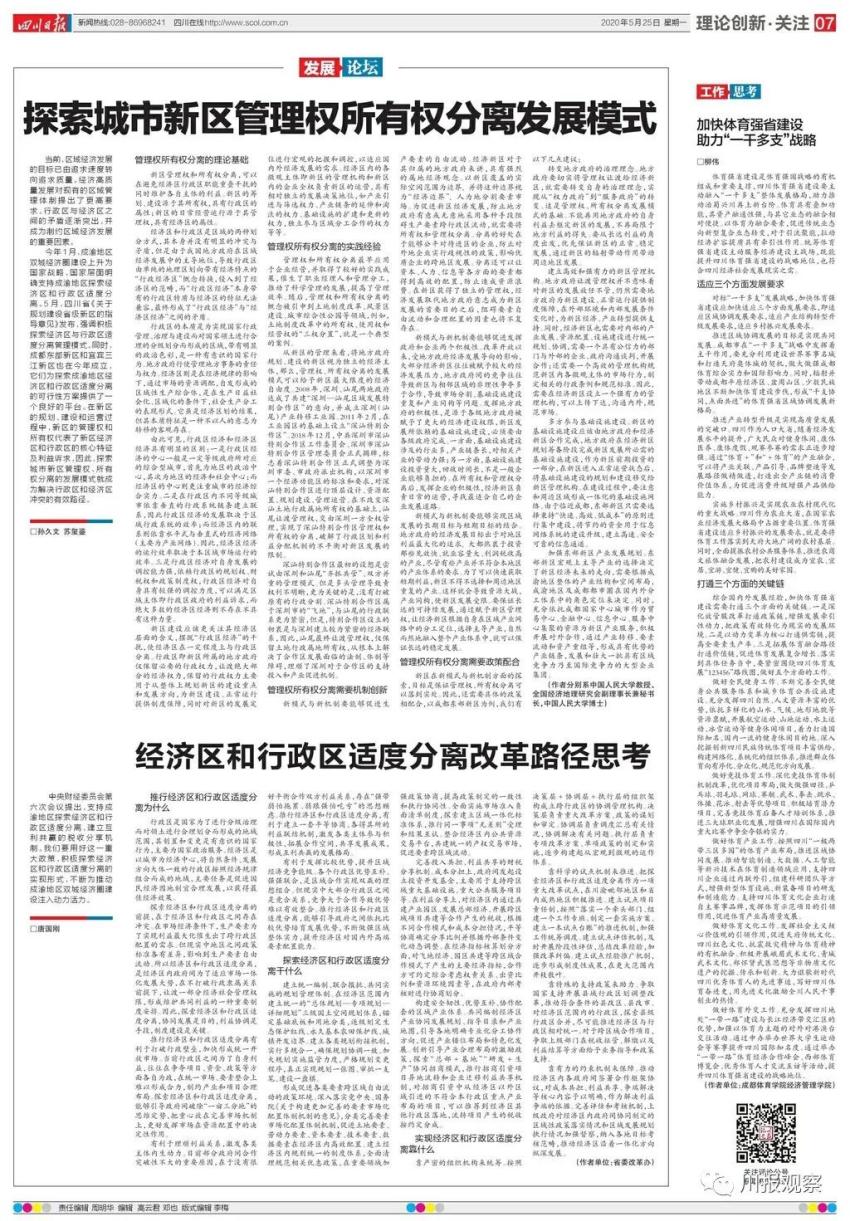 中央财经委员会第六次会议提出,支持成渝地区探索经济区和行政区适度分离。我省日前印发的《关于规划建设省级新区的指导意见》也提出,积极探索经济区与行政区适度分离管理模式。
