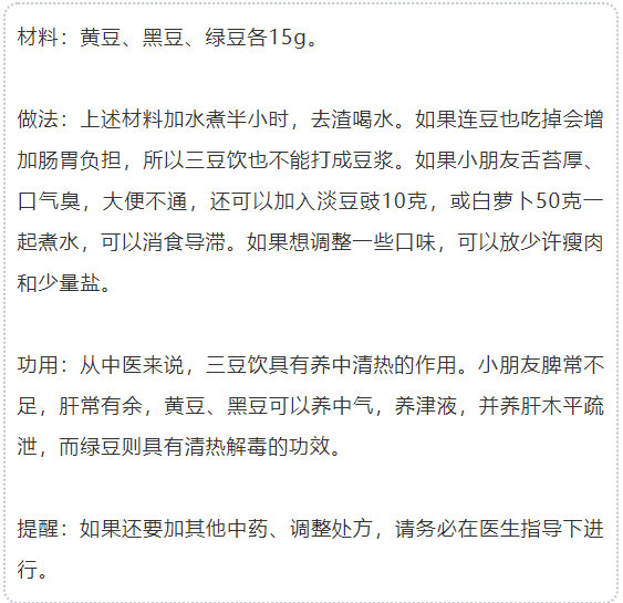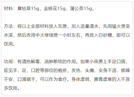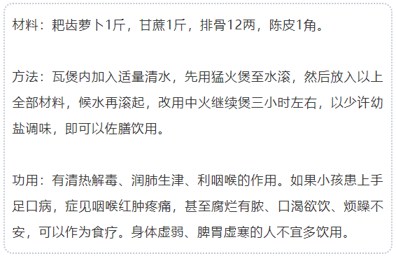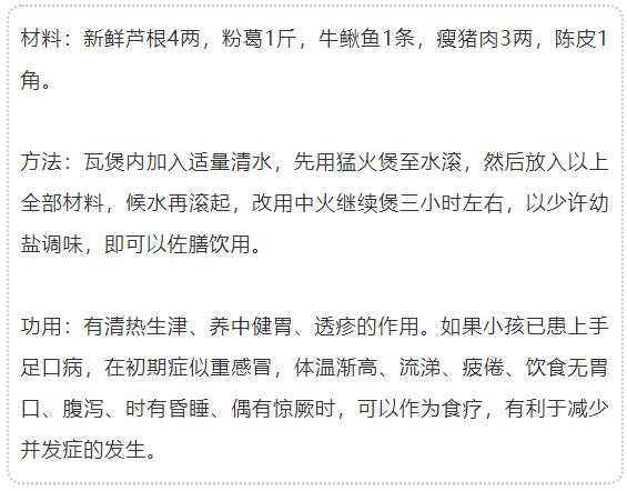 广州市第一人民医院南沙中心医院主治中医师邓聪介绍,预防手足口病关键在调理脾肺。除了三豆饮,以下几道汤谱,日常食用对预防手足口病也有一定的帮助作用。若已患病,也可根据功用作为饮食治疗,对于病症的消除有辅助作用。