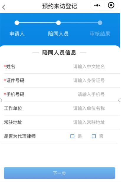 当事人或律师选择陪同人员时,在此页面填写陪同人员信息,填写完成即可提交预约。