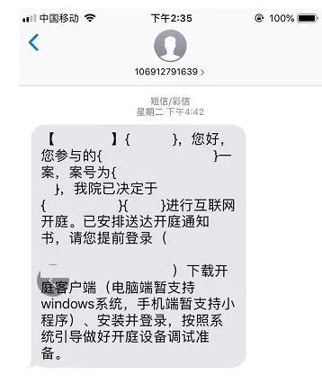 法官创建完庭审类型的庭审后,会给参会人员发送短信通知,提示参会人下载指定的客户端,进行登录。