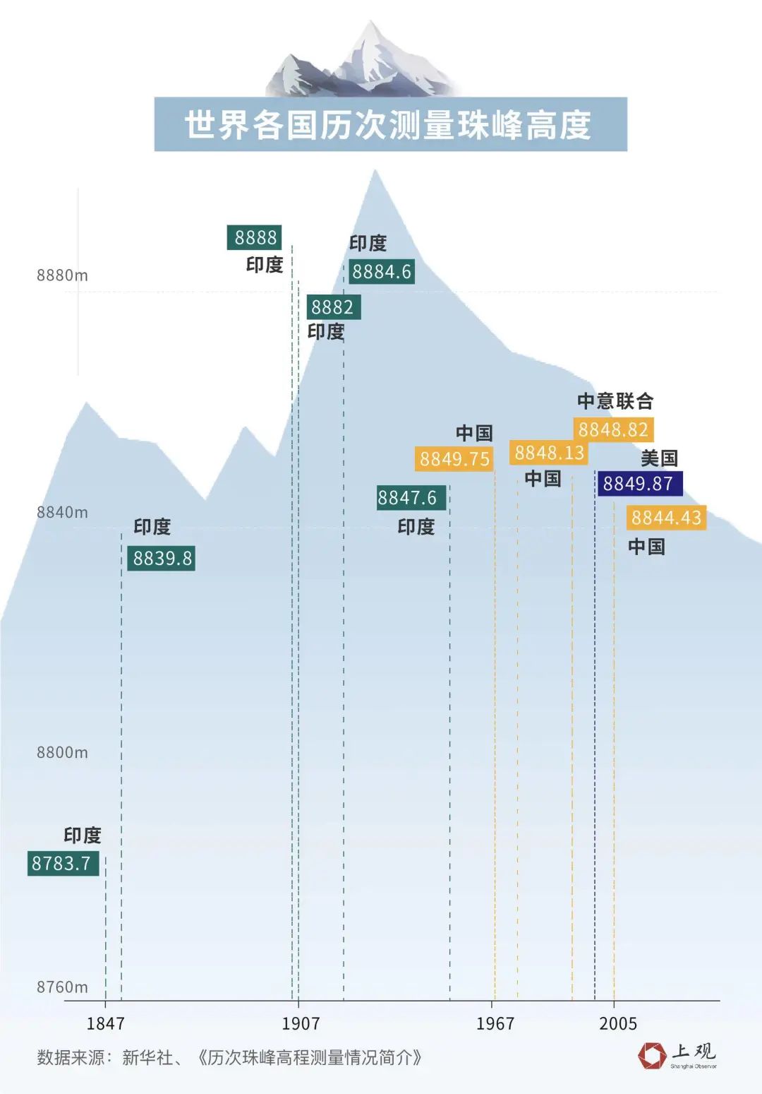 一直到上世纪50年代,都只有印度在坚持测量,并连续测量了6次。几次测量的结果出入都较大,1852年的测量结果较1847年上升了56米,1905年又较1852年上升48米,而1954年又较1921的结果下降了37米。