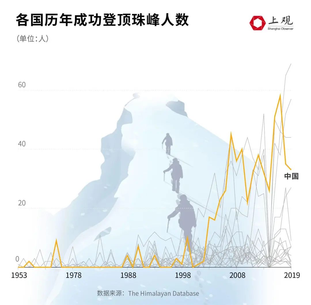 根据喜马拉雅数据库的记录,自1960年中国有573人又相继登上珠峰顶。进入新世纪后,挑战珠峰成功的人数明显增多,共有533人。2018、2019年单年登顶人数分别达到了35人及33人。登顶最多的一次在2017年,有58人。