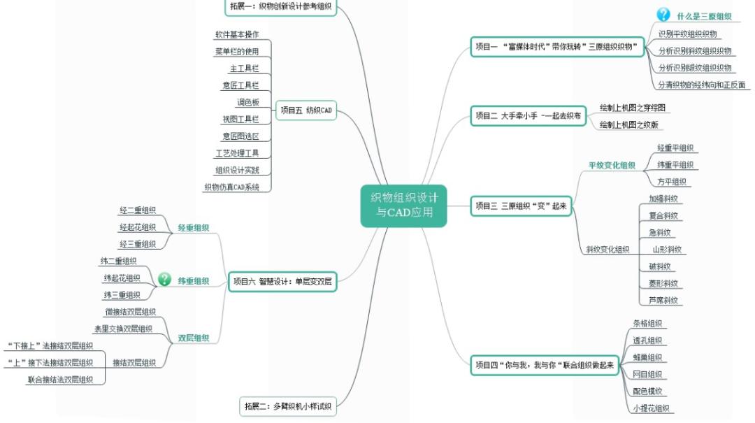 本课程分为5个教学模块。前导课程是《纺织材料应用》,后续课程是《机织工艺》、《纹织CAD》等。