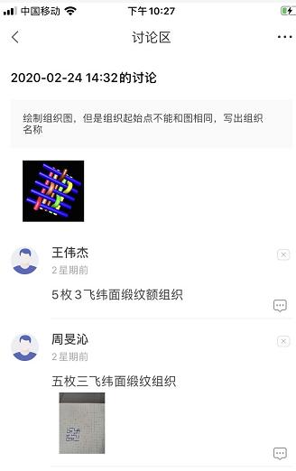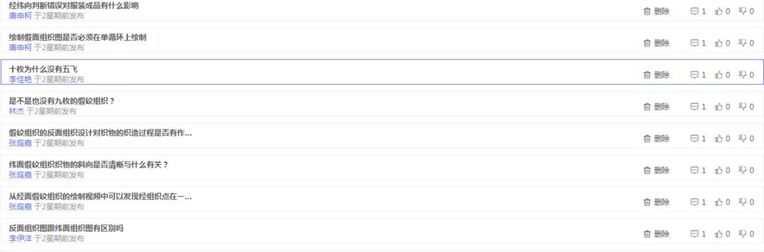 课前预备阶段主要采用在线模式,学生可应用云课堂平台在线学习。通过本单元教学设计的指引(见图,教学设计课前、课中、课后指引),指导学生完成缎纹组织织物分析这部分内容的预习,并通过课前平台发布学习任务。教师在课前可通过平台查看学生预习情况。在课前,可通过学习公告布置缎纹组织织物识别、缎纹组织组织图绘制、缎纹组织反面组织绘制视频、缎纹组织织物分析,引导学生带着问题去学习缎纹组织有关视频和PPT等。让学生完成课前任务,并在平台讨论区里提出不明白的问题(见图,学生讨论区留言),教师随时掌握学生的学习情况。并通过平台查看测试结果和分析,了解学生的自学情况。